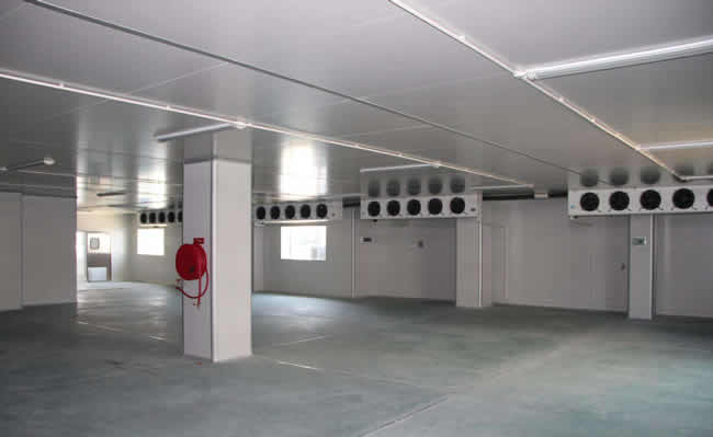 肉类冷冻库设计建造时,通常会采用150mm聚氨酯双面彩钢板,其特点有重量轻、安装便捷、保温隔热能抢、阻燃效果好等优势。